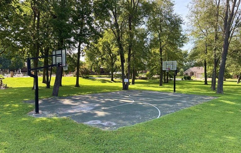 The basketball courts are beautifully framed by established and mature trees, offering natural shade and a serene environment.