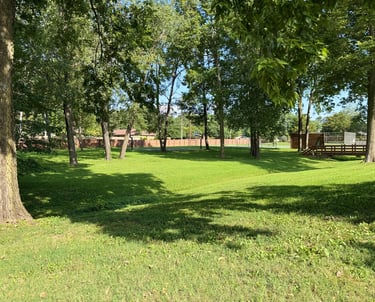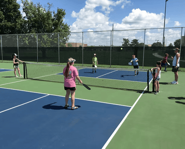 The pickleball courts are beautifully framed by established and mature trees, offering natural shade and a serene environment.