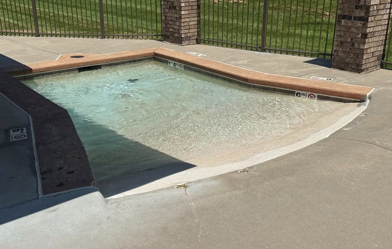 The pool includes a deep section for diving or advanced swimmers, complemented by a gradual, beach-like entry designed for kids to safely wade in. The beach area is surrounded by fountains to provide some fun and cooling relief during the summer heat.